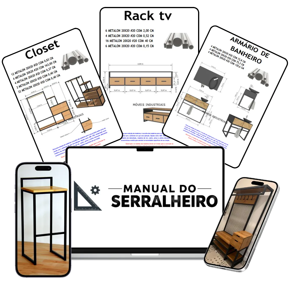 É um material digital com +1000 projetos de móveis industriais prontos, todos com medidas, lista de materiais, planos de corte e instruções de montagem passo a passo.
